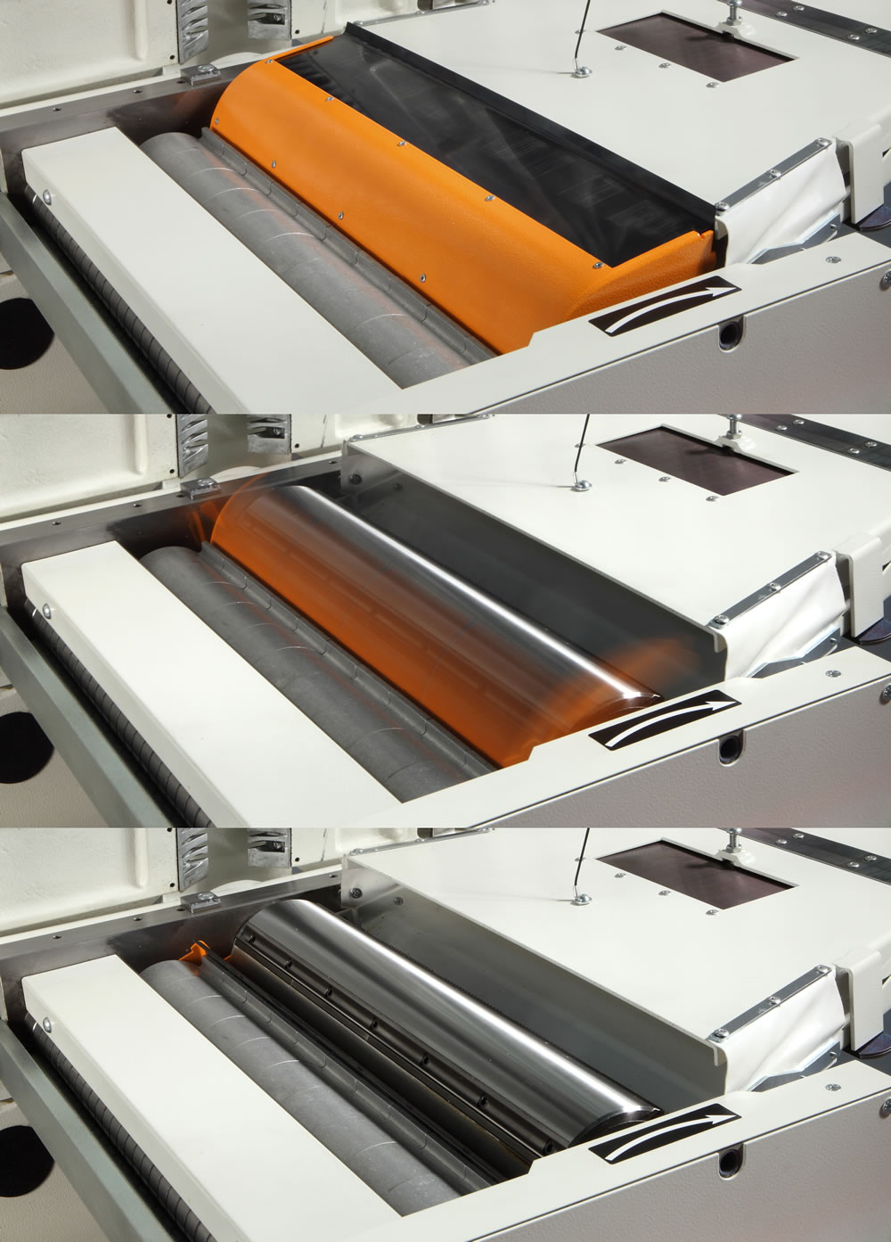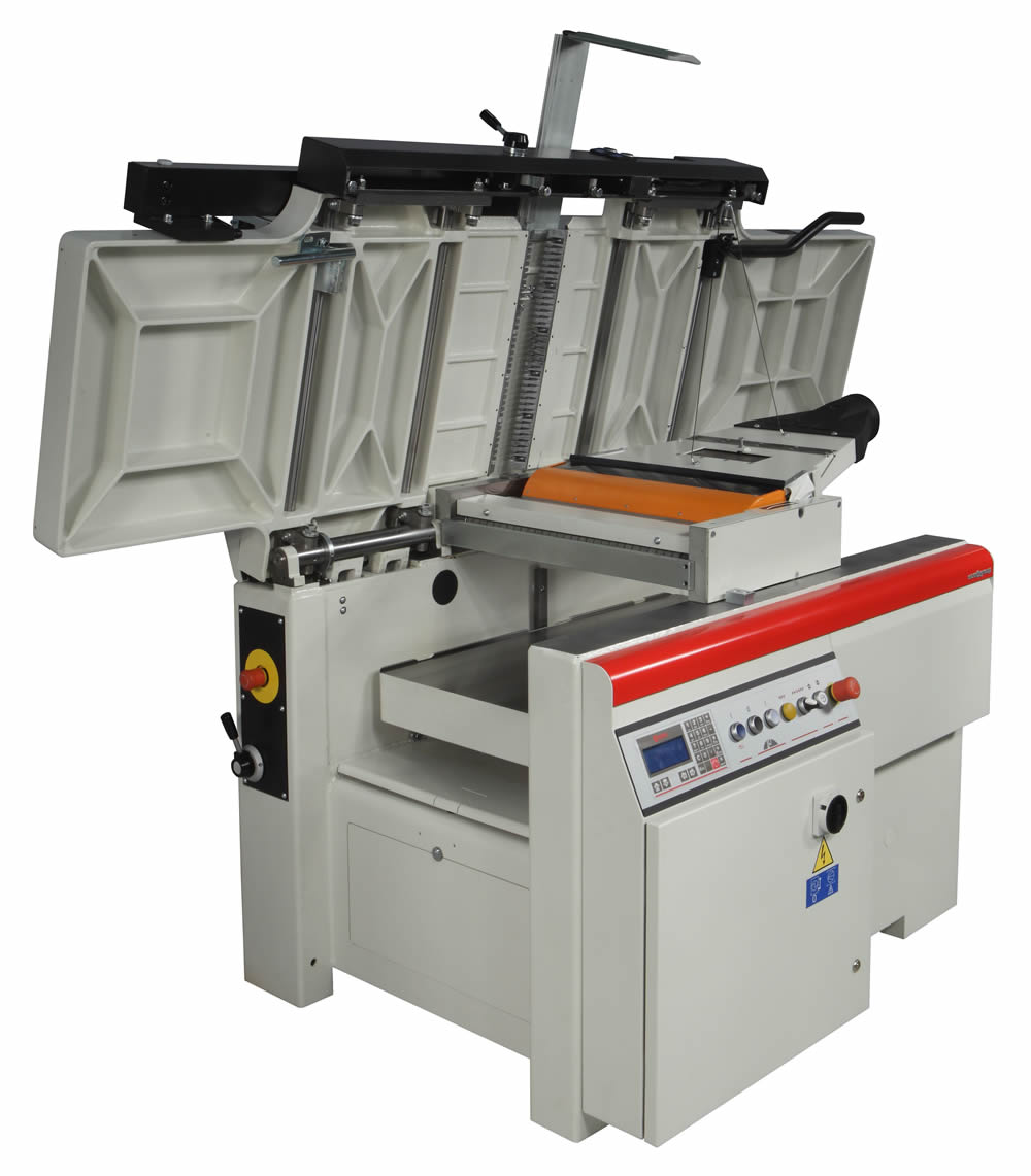 | Apertura de las mesas simultanea: garantiza una perfecta planaridad. El sistema permite el paso del trabajo del regrueso con un solo movimiento asegurando la velocidad y precisión del trabajo. |