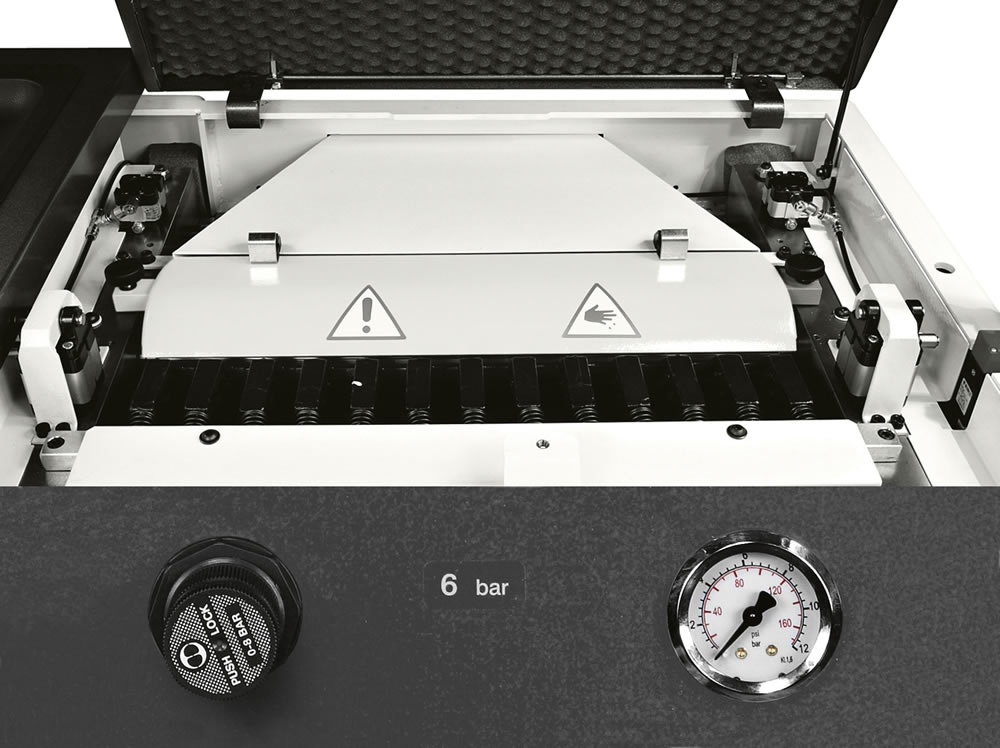 | El mejor acabado y eficacia de arrastre sobre cualquier material y en cualquier condición de trabajo gracias a la regulación neumática del empuje sobre los rodillos que permite variar en cualquier momento la presión sobre la pieza. |