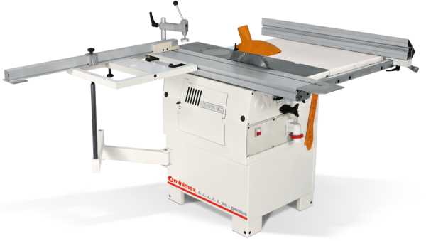 Grande precisión y facilidad de utilización: la subida/bajada y la inclinación del grupo sierra se reralizan por medio de comodos volantes. El carro deslizable en aluminio anodizado tiene un recorrido de 1200 mm y desliza cerca del disco para una mejor precisión de corte.